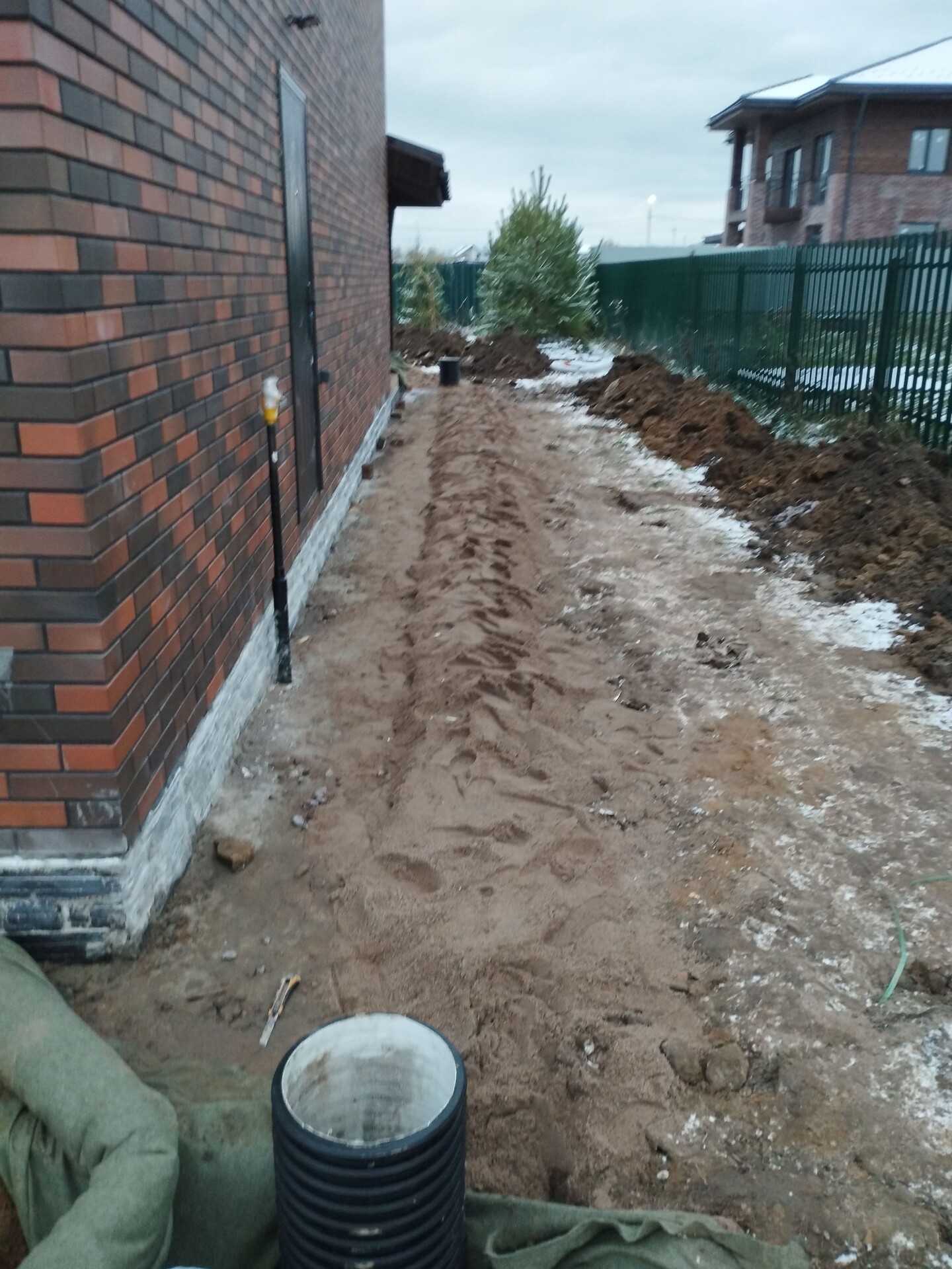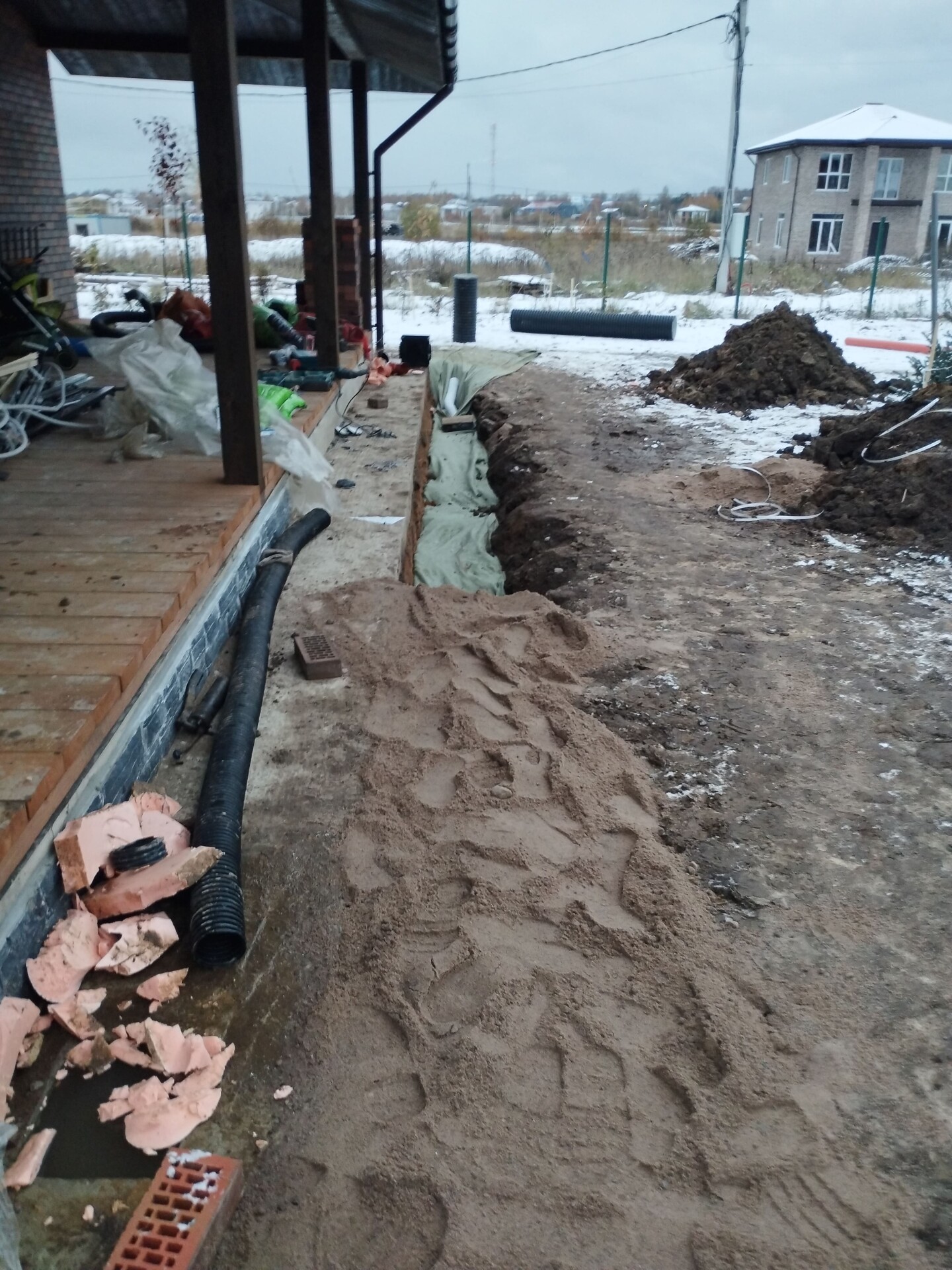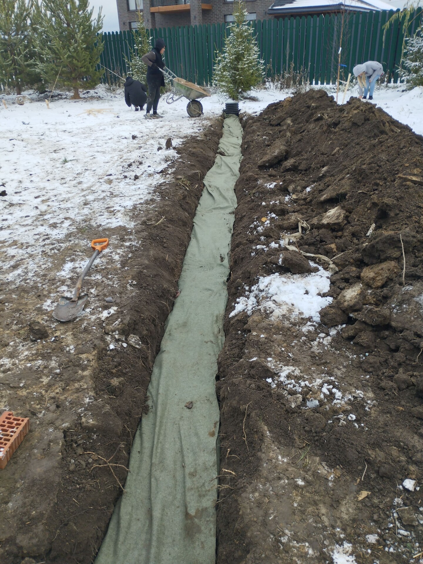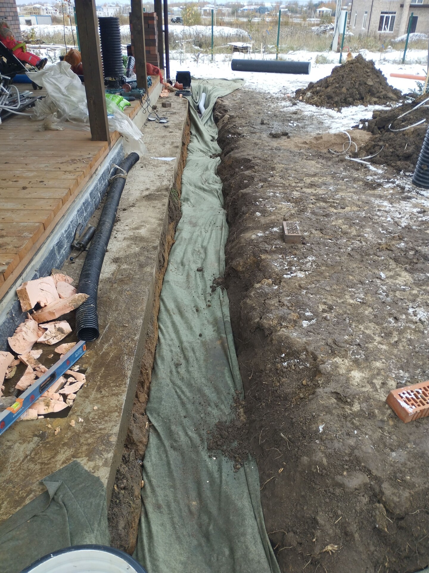 Потребовалось вскрывать бетонную отмостку и дорожное полотно для прокладки труб. Выполнено за 3 дня с применением 2-х экскаваторов для аккуратной копки траншей. 95 метров "классического" дренажа и 75 метров ливневки.