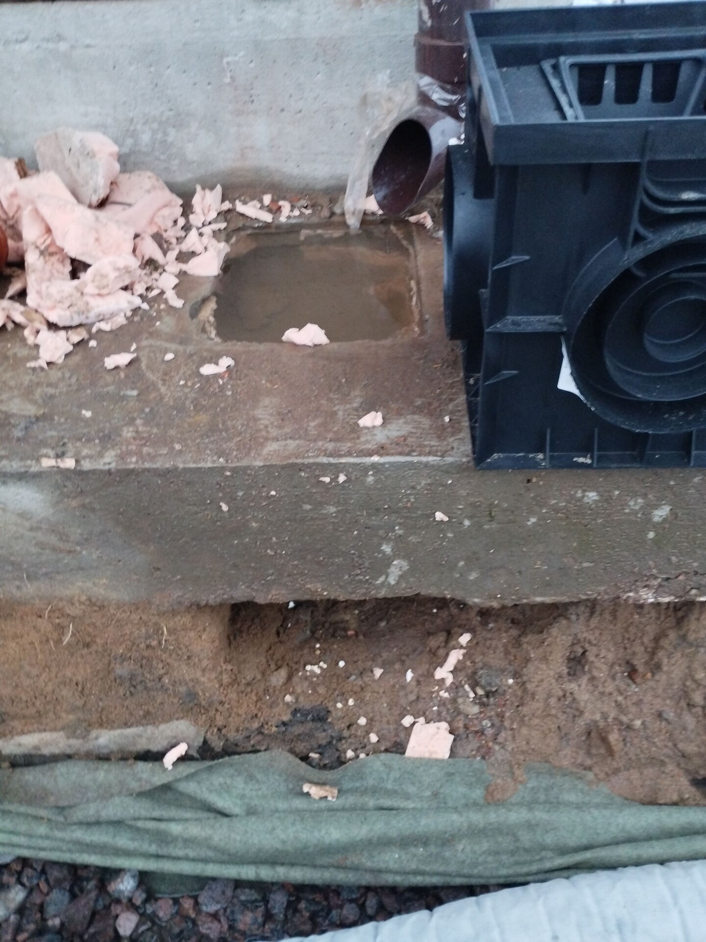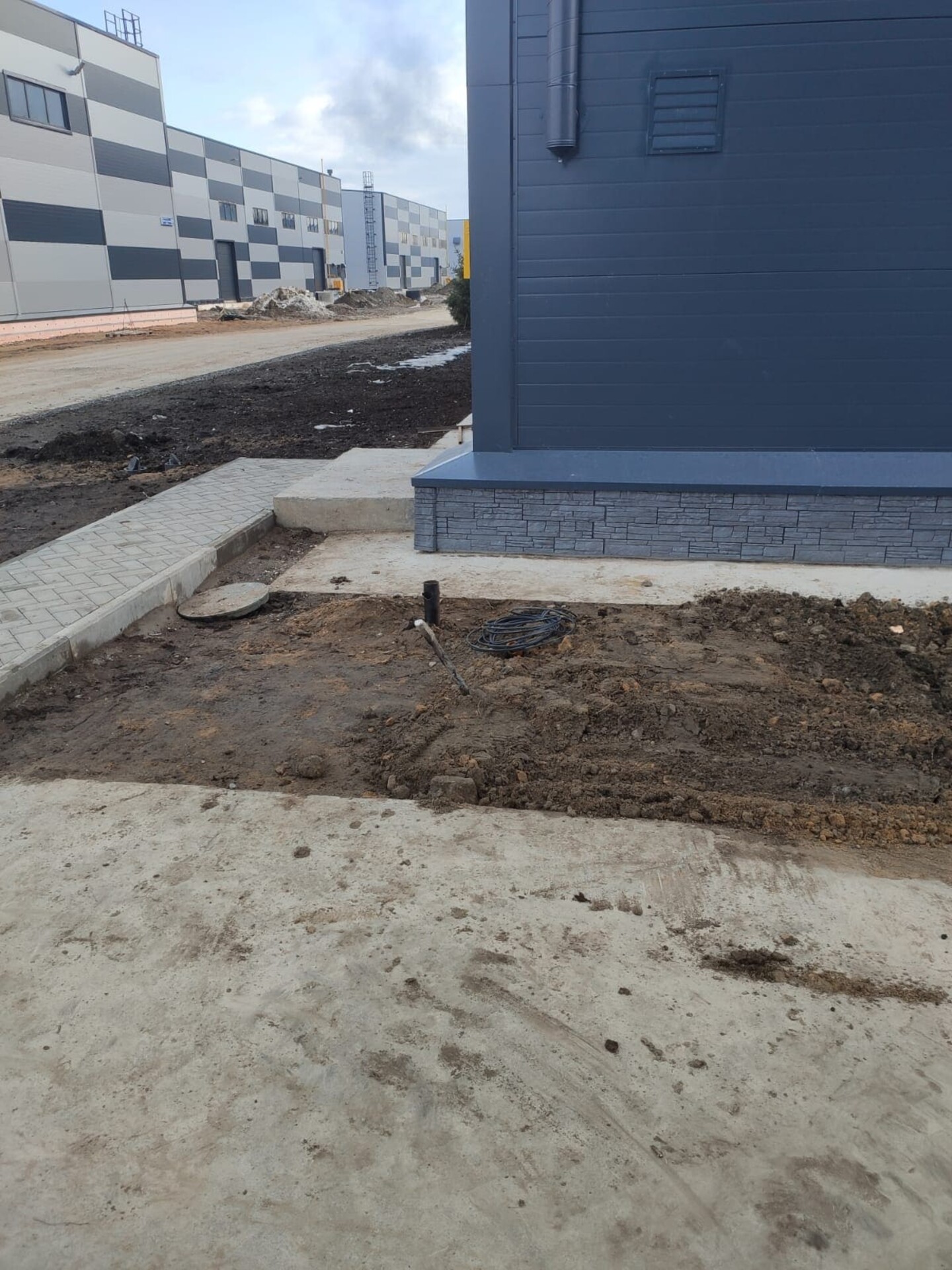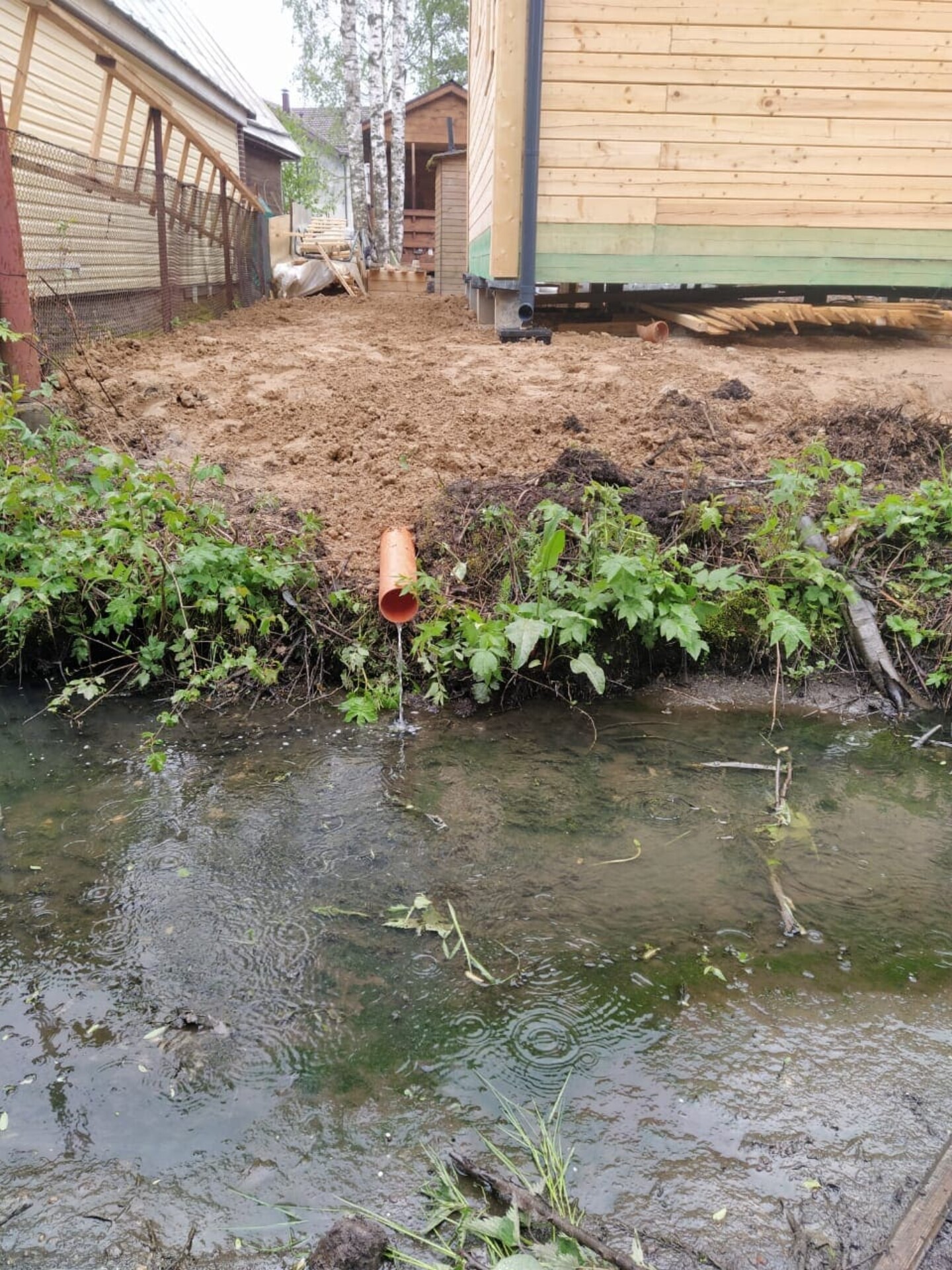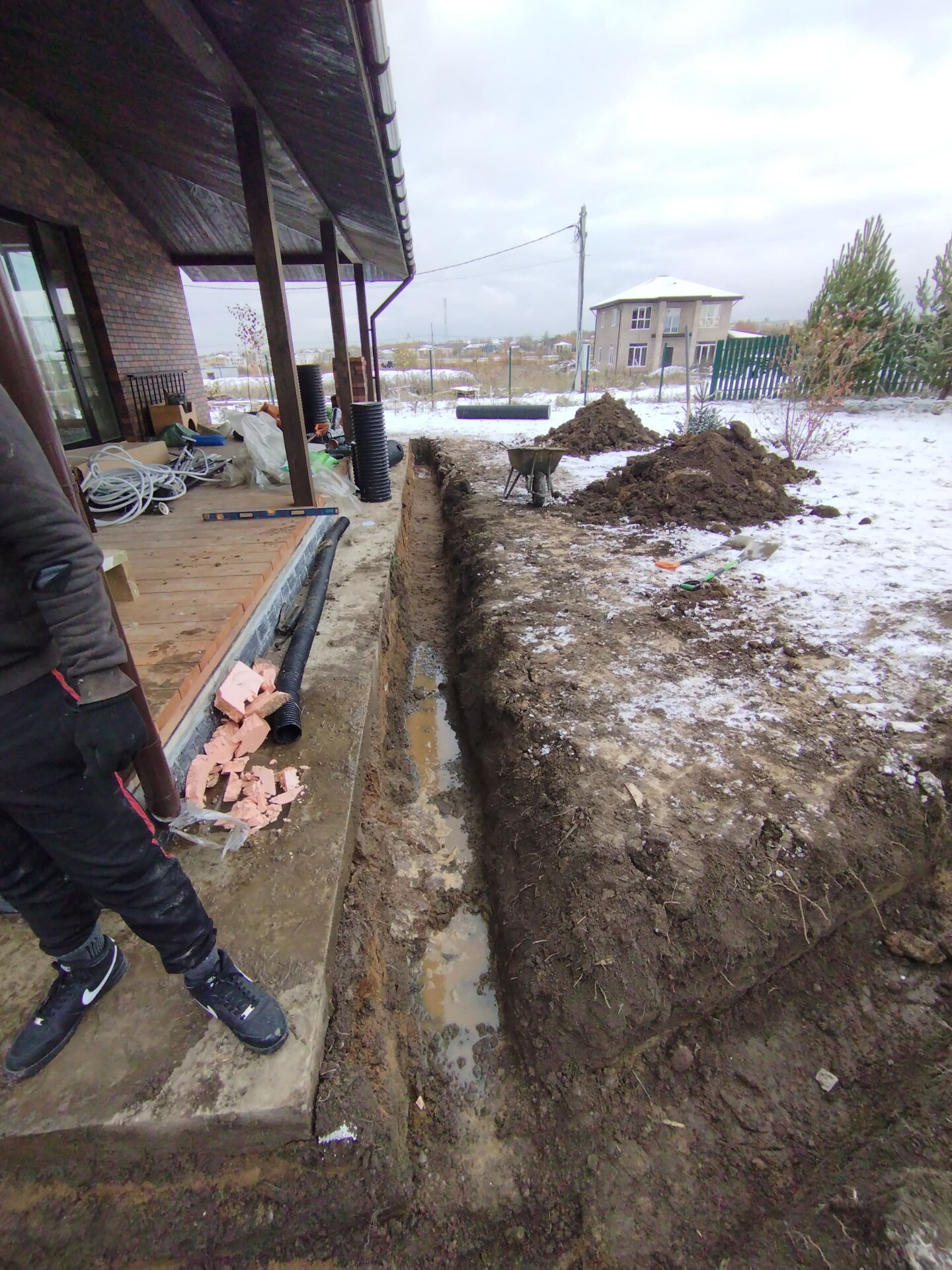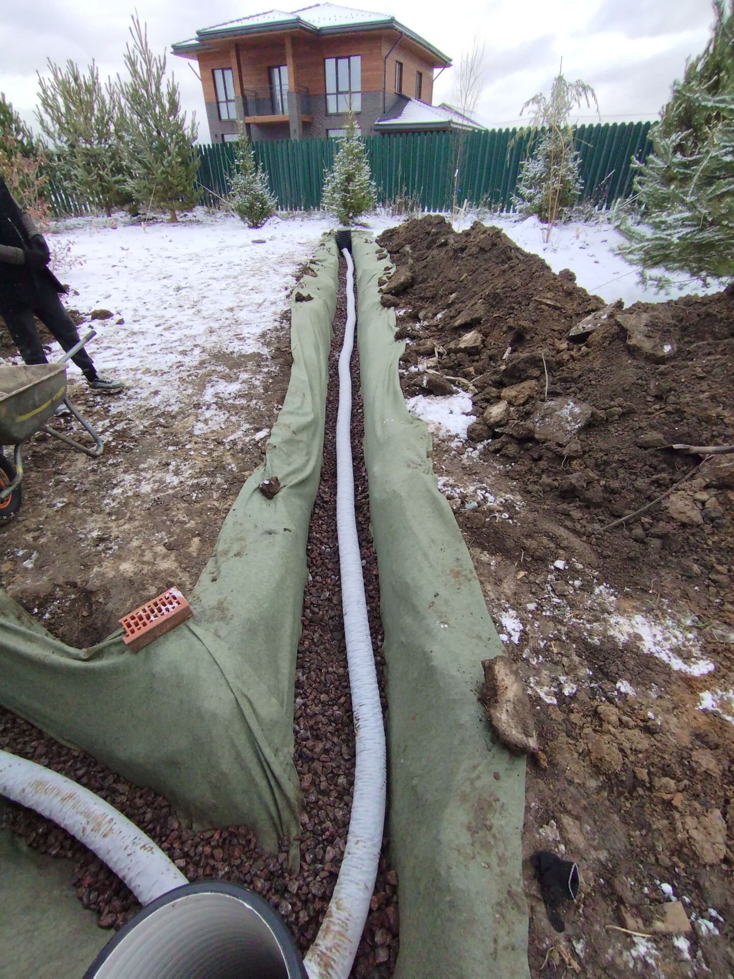 Потребовалось вскрывать бетонную отмостку и дорожное полотно для прокладки труб. Выполнено за 3 дня с применением 2-х экскаваторов для аккуратной копки траншей. 95 метров "классического" дренажа и 75 метров ливневки.
